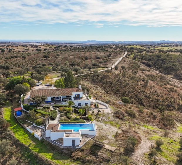 The “Monte das Jangarelas” is a haven of serenity in the heart of the Alentejo, offering wide views over the countryside and complete privacy. Set on a 7-hectare property, it is located between Reguengos de Monsaraz and Alandroal, with excellent access and a peaceful rural atmosphere. The main house, with around 280 m² and traditional Alentejo design, is in excellent condition. Highlights include a spacious rustic lounge with a traditional fireplace, wooden ceilings and terracotta flooring. It offers four suites and, on the lower level, an independent apartment. It is equipped with air conditioning, PVC windows with double glazing and mosquito screens. Outside, it features a pergola, an infinity-view pool, a well-kept garden and parking. An olive grove, cultivation area, borehole, septic tank and automatic gate complete the property, located just 15 minutes from Alqueva and 1h50 from Lisbon.