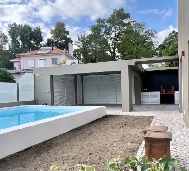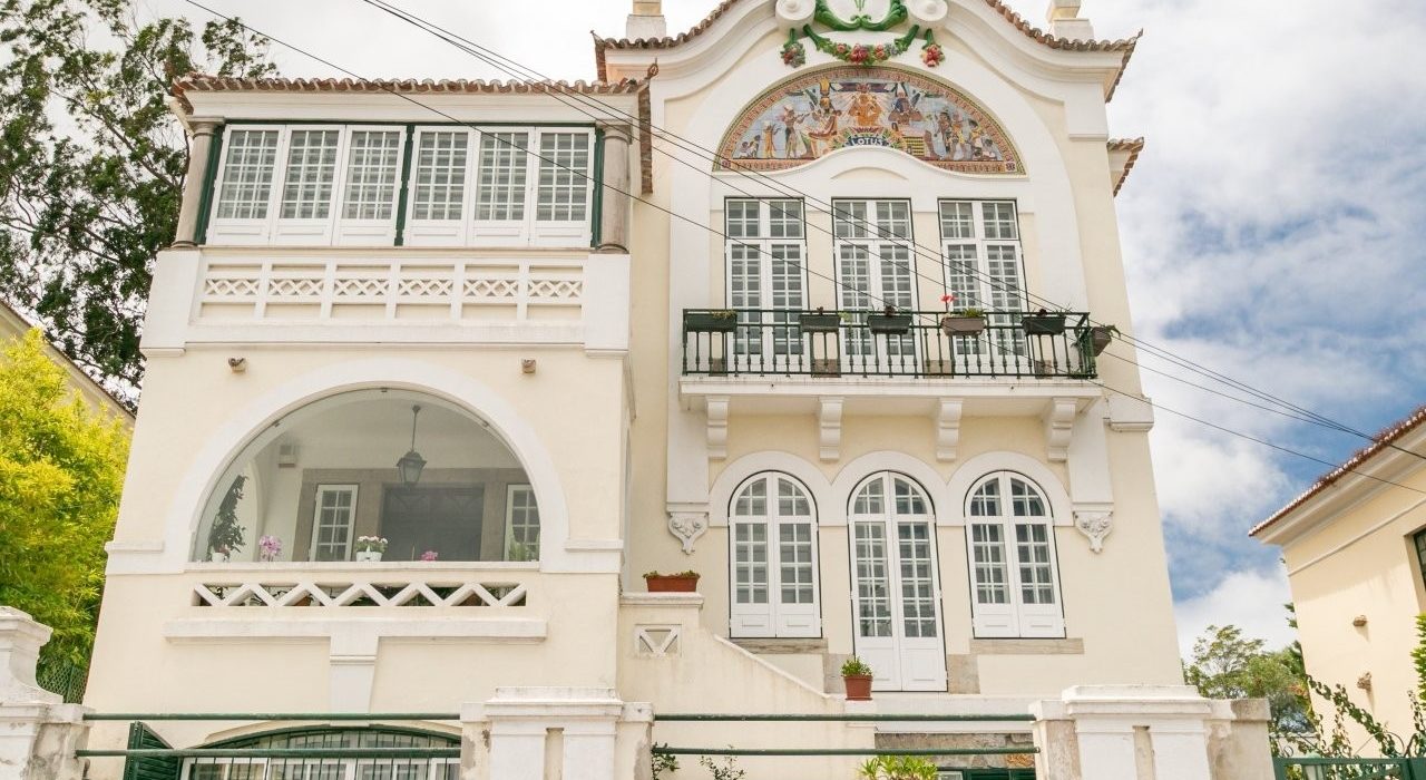 Strolling through the charming streets of Sintra’s historic center, with views over the surrounding nature, we find “Casa Lotus” — a unique residence designed by Norte Júnior, a renowned architect known for his Art Nouveau style. Upon entering, the noble wooden entrance hall and staircase immediately impress. The three living rooms, with a shared central fireplace, are filled with natural light and