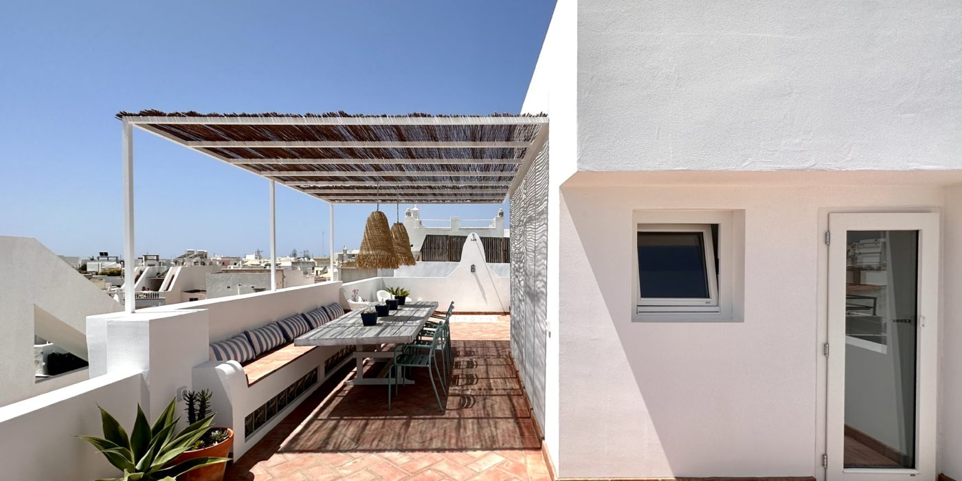 Moradia típica de Olhão totalmente renovada, com 4 quartos e amplo terraço rooftop, no centro histórico. Distribuída por 4 pisos: no piso 0, corredor de entrada, um quarto em suite, wc social e espaçosa área social em open space (sala de estar, jantar e cozinha) com luz natural através de janelas Velux. No piso 1, três quartos (um em suite com varanda) e uma casa de banho partilhada. O piso 2 conta com terraço equipado com mesa, cozinha de verão em alvenaria e chuveiro exterior. No piso 3, terraço com vista panorâmica de 360º sobre Olhão e a Ria Formosa. A renovação alia tradição e modernidade, com porta azul em madeira, mosaicos hidráulicos, teto abobadado, cozinha feita por medida, equipada com eletrodomésticos de qualidade, e armários em madeira maciça. Confortável e funcional, é ideal como residência permanente ou pied-à-terre.